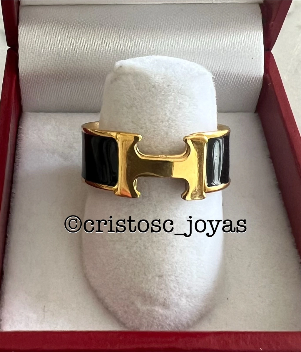 Talle 7 americano, es un talle 14 de acá. Es acero y tiene una lamina de baño dorado. Dorado con negro.