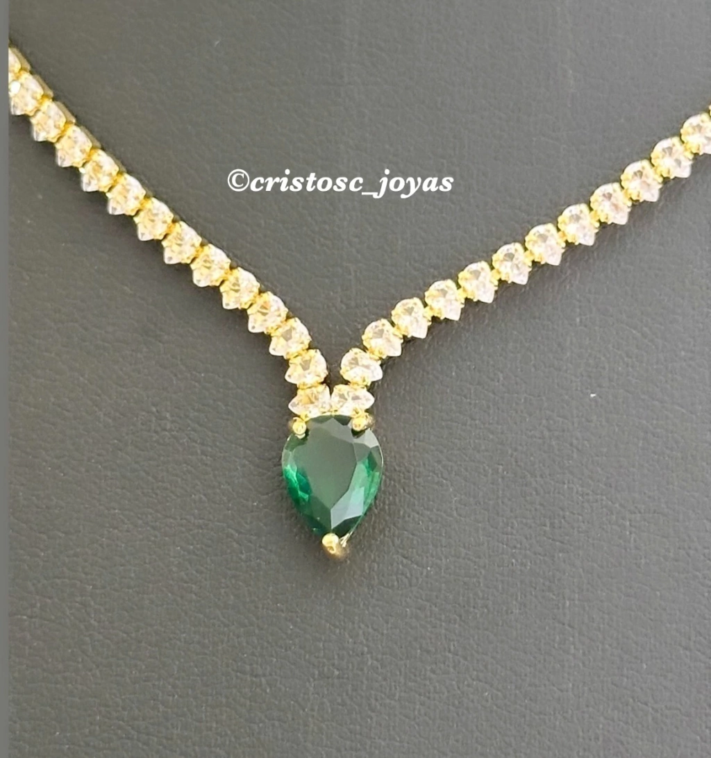 Gargantilla de cristal en forma de lágrima, bañada en oro. Circon verde en forma de lágrima bañada en oro oro. Medida: : 40 cm total