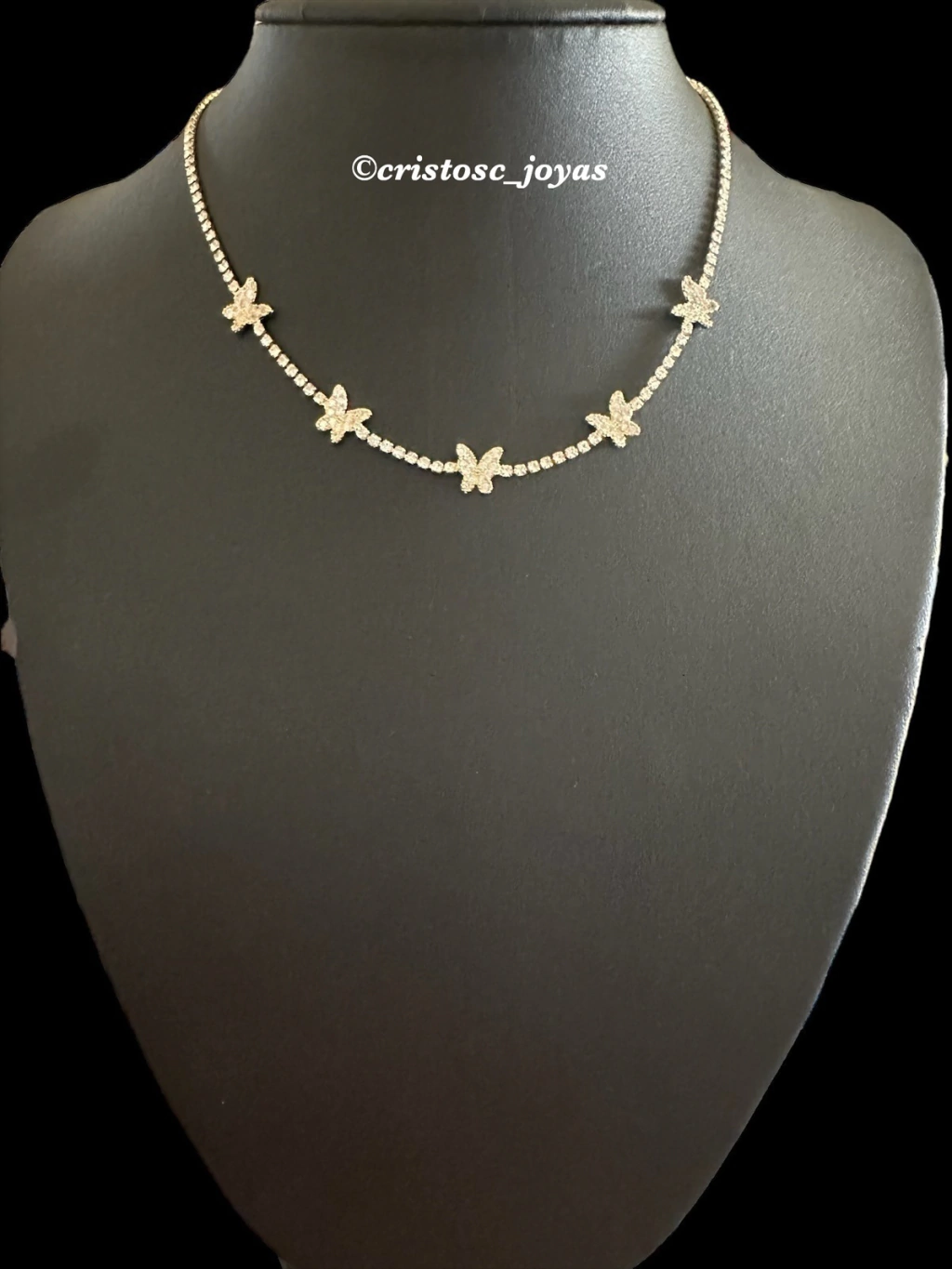 Cadena de cristal y mariposas, bañada en oro. Medida: 35 cm + 5 cm de extensión