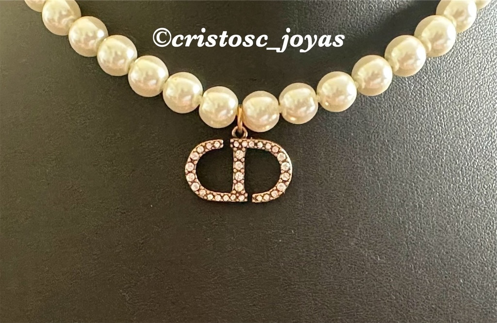 De Perlas con logo en dorado envejecido y strass. Medida: 35 cm